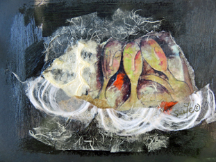 "Following the Peace and Freedom". Acrylic on woodboad with texture paper and fabric. permnatenly collected by the museum