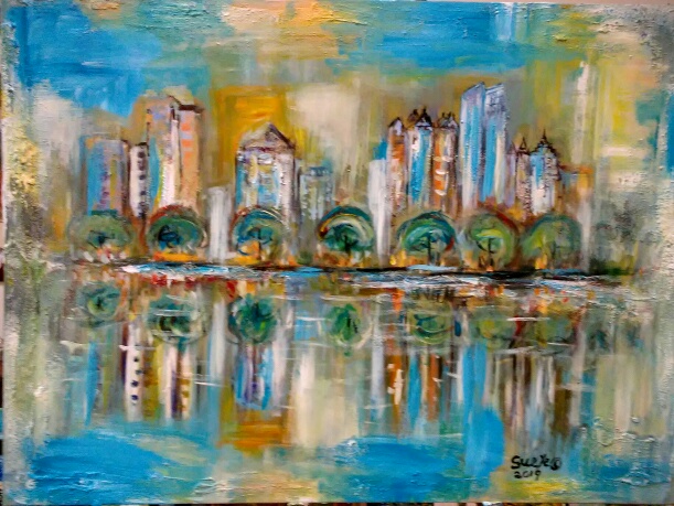 "Paradise City & Lake" #1 acrylic on canvas. 30" x 40" x2" finished July 2019. sides painted. ready to hung. . call artist for more info. limited edition on canvas only